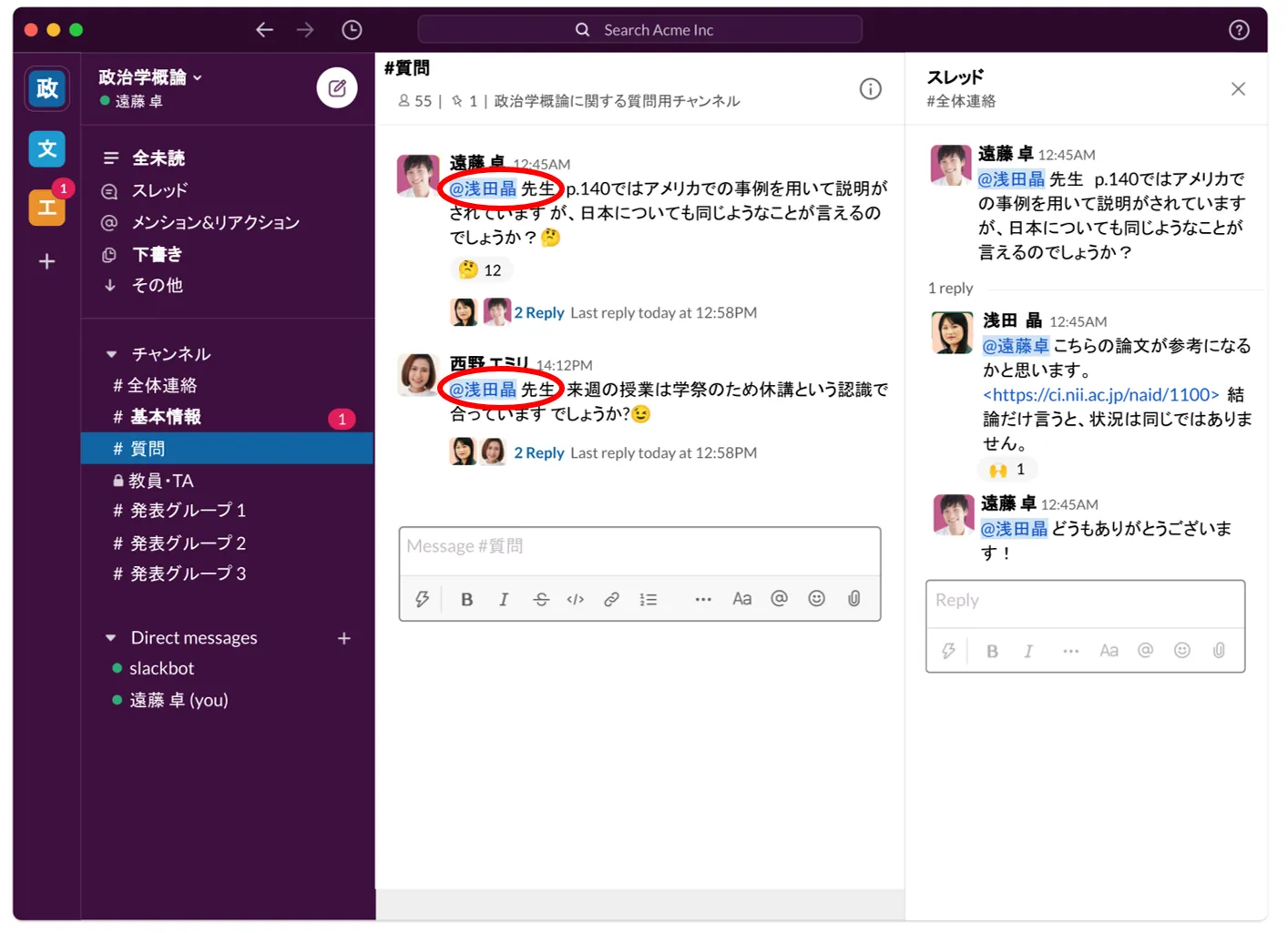 確実にレスポンスがもらえるように,教員をメンションするとよいでしょう.赤丸のようにSlackでの登録名の前に@をつけることでメンションできます.