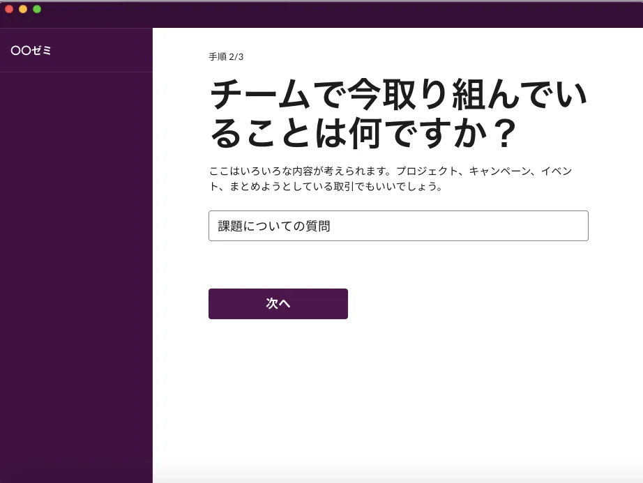 - ワークスペース(例:授業名)を設定します.「社名またはチーム名」はワークスペースの名前になります.授業で使用する場合,ワークスペース名はどの授業か一目で分かる名前にしましょう.ここでは「〇〇ゼミ」というワークスペースとします.