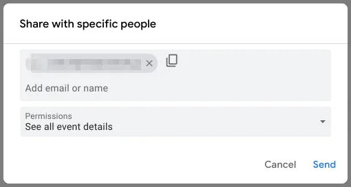 4. Enter the Google account you want to share and set the access rights to the calendar. There are four types of permissions.