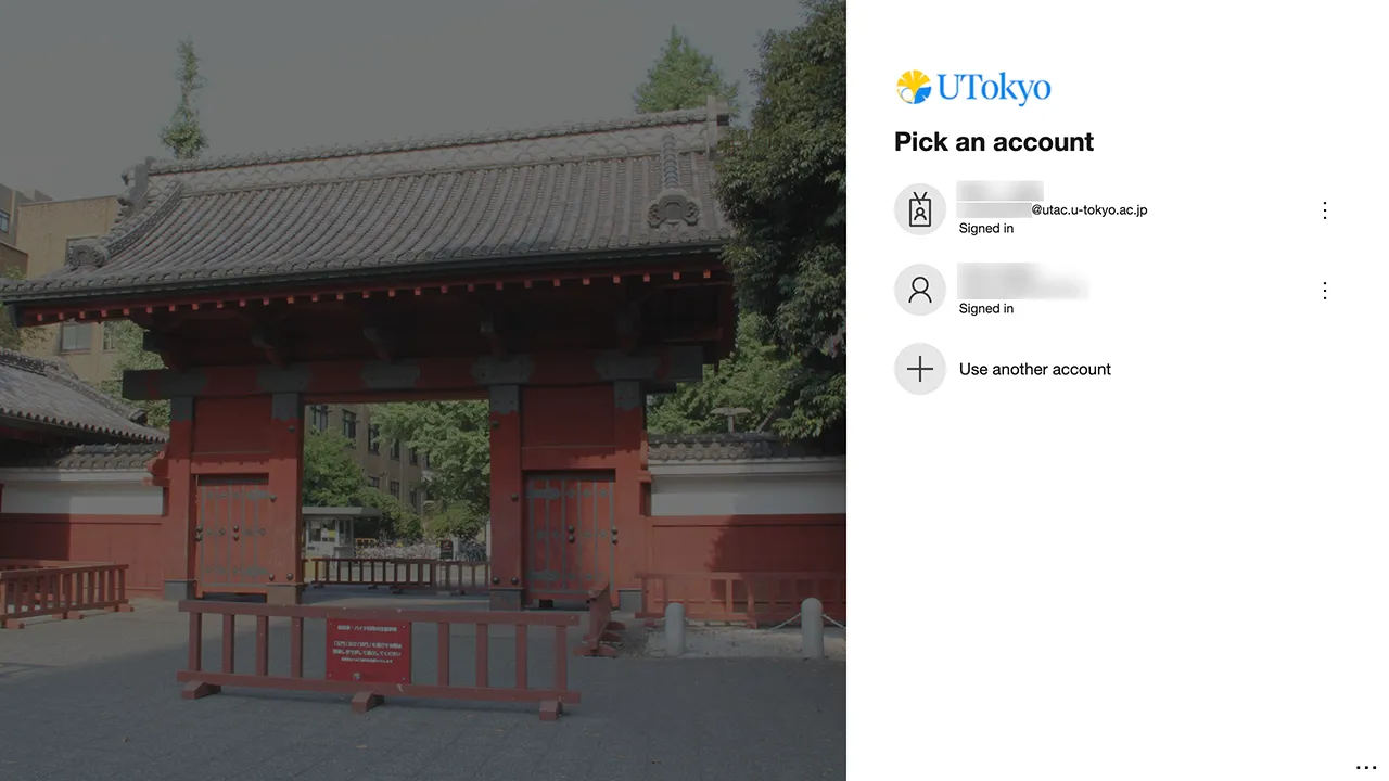 Additionally, during sign-in, you may see a screen like the following. In this case, please select the item labeled “10-digit Common ID + @utac.u-tokyo.ac.jp”.