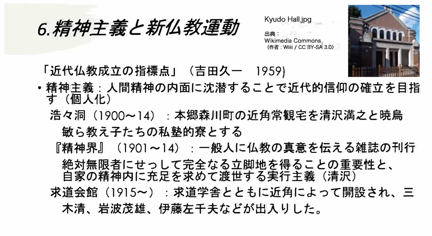 近年、近代の宗教史像の見直し作業が目覚ましい。この授業では、近代日本の宗教史を理解する上での基本的なトピックを概説的に紹介しながら、近年の研究動向を紹介する。受講者には、それを通して固定的で平板な「宗教」の捉え方から脱して、新たなアプローチ法を見出してほしい。