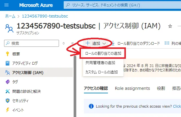 Role assignmentsタブをクリックしてください. - 切り替わった画面に,追加したメンバーが正しいロールで追加されていることを確認してください.