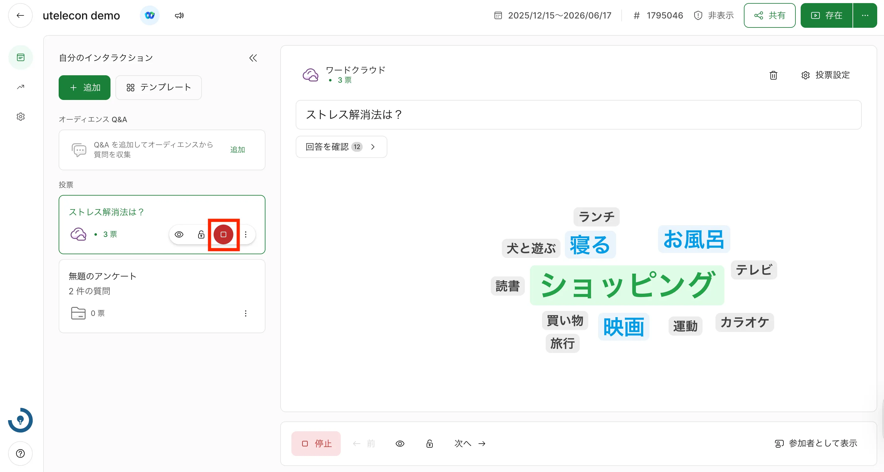 赤いボタンをクリックすると,画面右側に表示されていた投票が終了します.再度参加者への投票の表示を行いたい場合は,画面左側の投票についている緑色のボタン(元々赤色のボタンだったもの)をクリックして下さい.