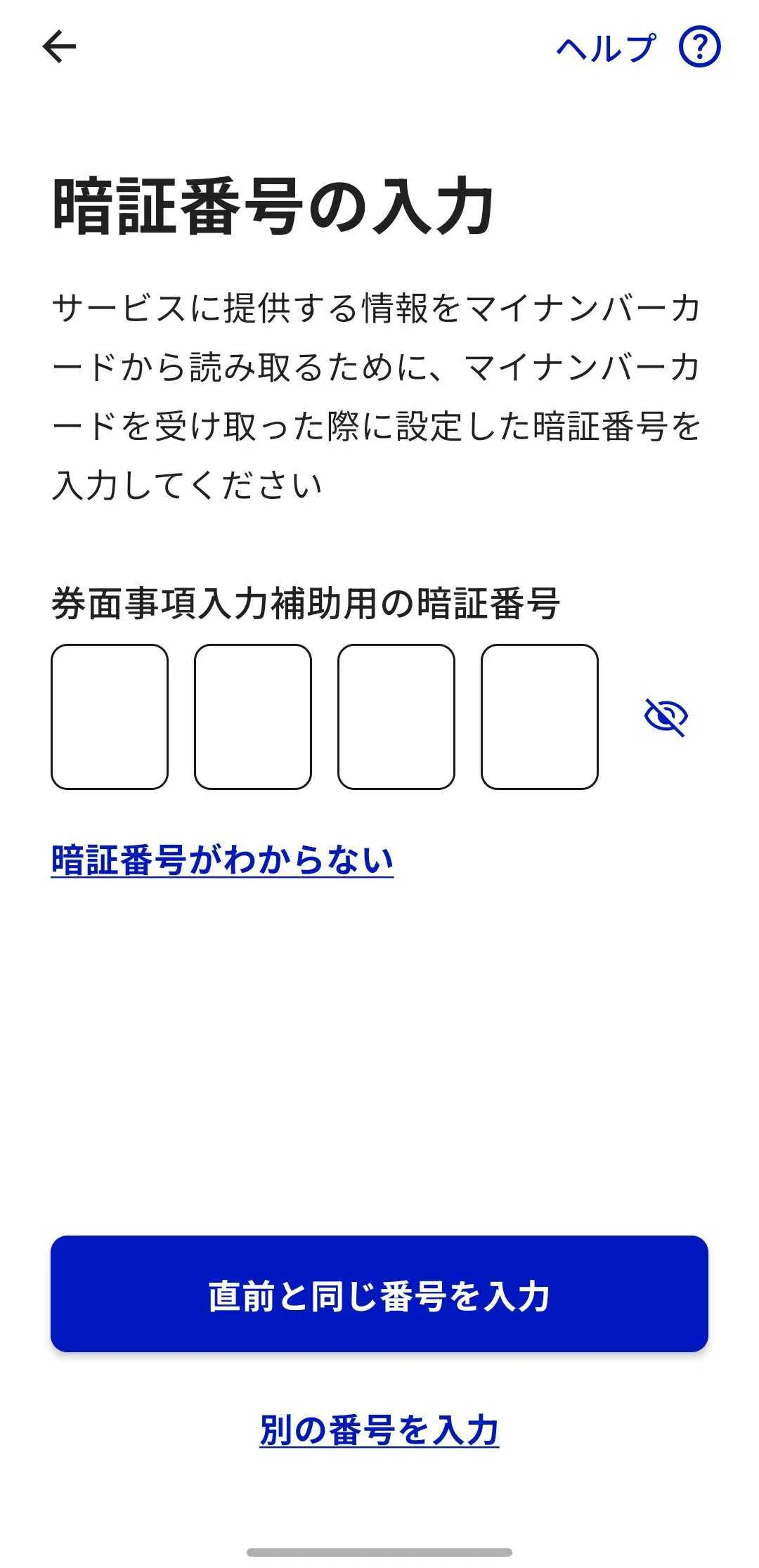 券面事項入力補助用の暗証番号を入力してください.利用者証明用電子証明書の暗証番号と同じ物を使用している場合は「直前と同じ番号を入力」ボタンを押すことで省略できます.