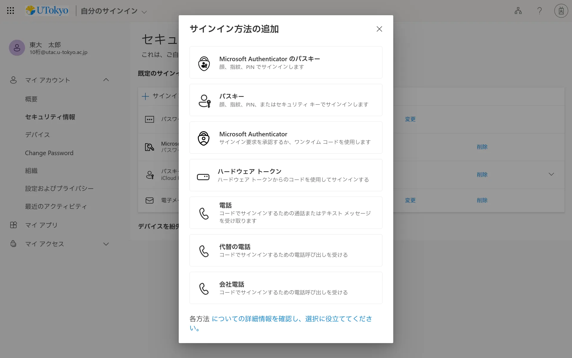 FIDOセキュリティキーは,2個目以降の本人確認方法として登録することを前提としています.多要素認証を初めて利用する方は,「UTokyo Account多要素認証の初期設定手順」の中の「手順1:1個目の本人確認方法を登録する」の手順に従って1個目の本人確認方法を登録してから,追加の本人確認方法としてFIDOセキュリティキーを登録してください.
