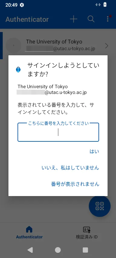 - Microsoft Authenticatorの場合:スマホに通知が送られ,サインイン画面に表示されている2桁の数字を入力するように求められるので,そのようにしてください.