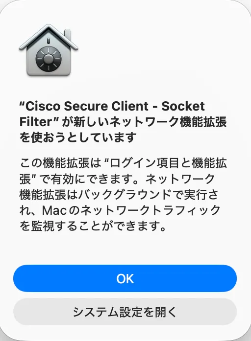 手順D: しばらく待つと,以下のような「必要なアクション Cisco Secure Client - システム」というポップアップが表示されることがあります.その際は表示される手順にしたがって,「システム設定」→「一般」→「ログイン項目と機能拡張」にすすみ,「機能拡張」の「カテゴリ別」を選択し,「ネットワーク機能拡張」の右にある「🛈️」ボタンをクリックし,表示された項目のうち「Cisco Secure Client - Socket Filter」を有効にしてください.この際,以下のような「“Cisco Secure Client - Socket Filter”がネットワークコンテンツのフィルタリングを求めています」というポップアップが表示されたら,「許可」をクリックしてください.