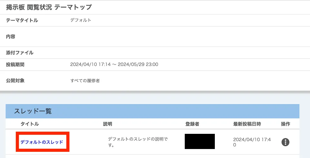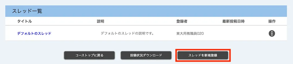 新たにテーマを登録すると,タイトルが「デフォルトのスレッド」であるスレッドが自動的に生成されます.スレッドのタイトルや説明を適切に設定することで,スレッドの目的をわかりやすく示すことが可能になるので,必要に応じてスレッドを編集してください.