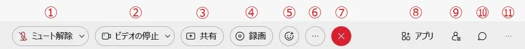- ビデオ: 黒くなっているときはカメラがオンになっています.カメラがオフになっているときは赤くなります.ネットワーク環境が不安定な場合,ビデオを停止(アイコンを赤くする)しましょう.