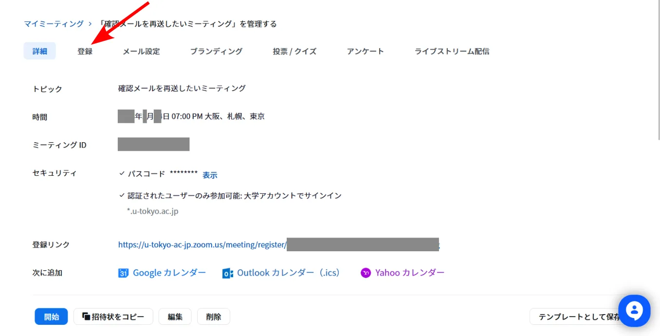 ミーティングの情報が表示されます.上の方に「登録」「メール設定」等のタブが並んでいます.「登録」タブを選択してください.