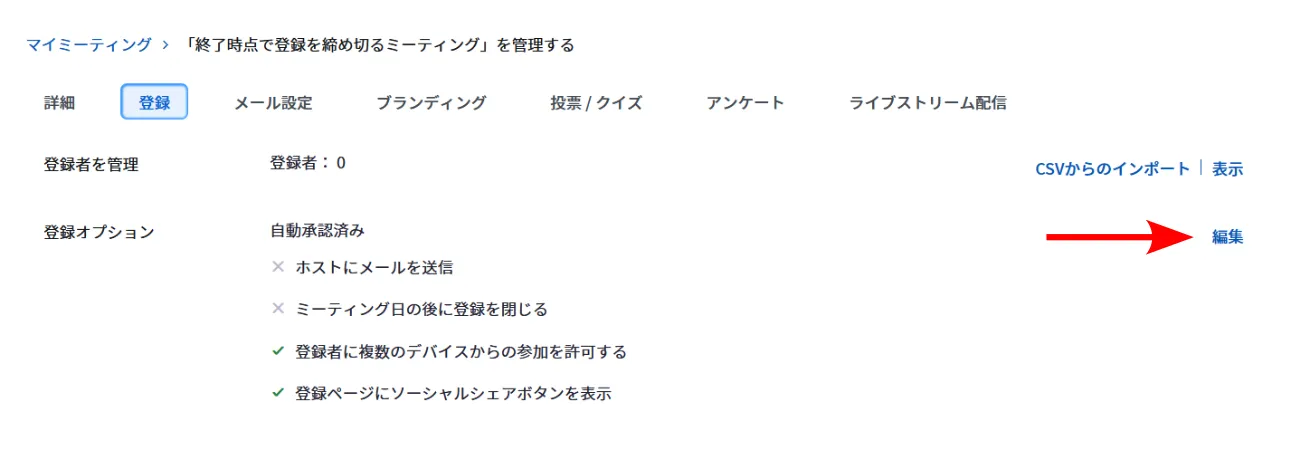 - 「ミーティング日の後に登録を閉じる」チェックボックスをオンにしてください.