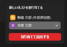 ホストの退室に伴ってミーティングを終了させる場合,「全員に対してミーティングを終了」を選択してください.もし,ホストが退出した後も他の参加者にホストを移動させてミーティングを継続させたい場合は,「ミーティングを退出」を選択したあと,ホストを移動させたい参加者を選択して,「割り当てて退出する」を選択してください.