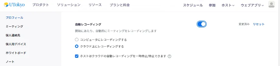 - なお,Zoomのウェブポータルの「設定」から,「レコーディング」を開き,「自動レコーディング」のトグルを選択して有効にしておくと,ミーティング別に設定を行わなくても,そのユーザーが作成する全てのミーティングで自動的にレコーディングが開始されます.